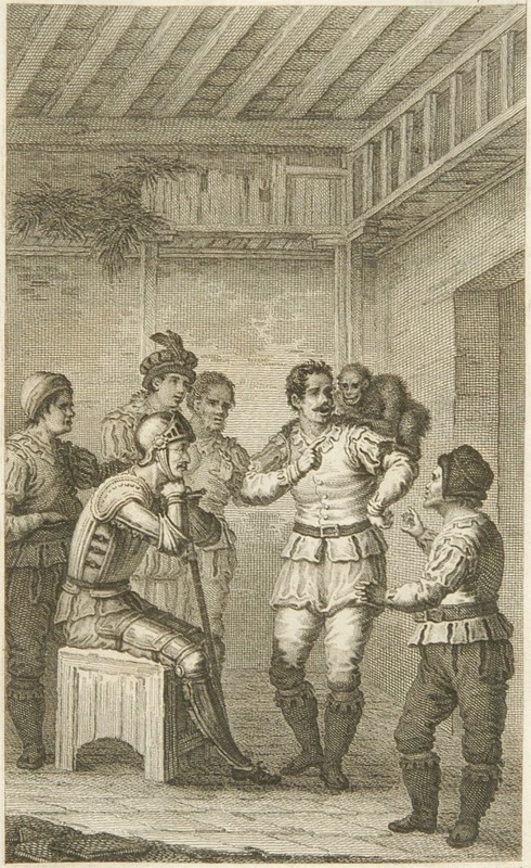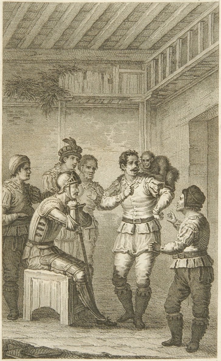 At the inn, Sancho Panza gives Maese Pedro two reales and asks the monkey to tell him what his wife Teresa is doing and how she is spending her time. The monkey leaps on the puppet master’s shoulder and clicks his teeth together, making as if he were whispering the answer to the question in his ear. Maese’s left eye is covered with a patch of green taffeta. Signed by J. Rivelles (illustrator) and A. Blanco y Asensio (engraver). Part 2, ch. 25.