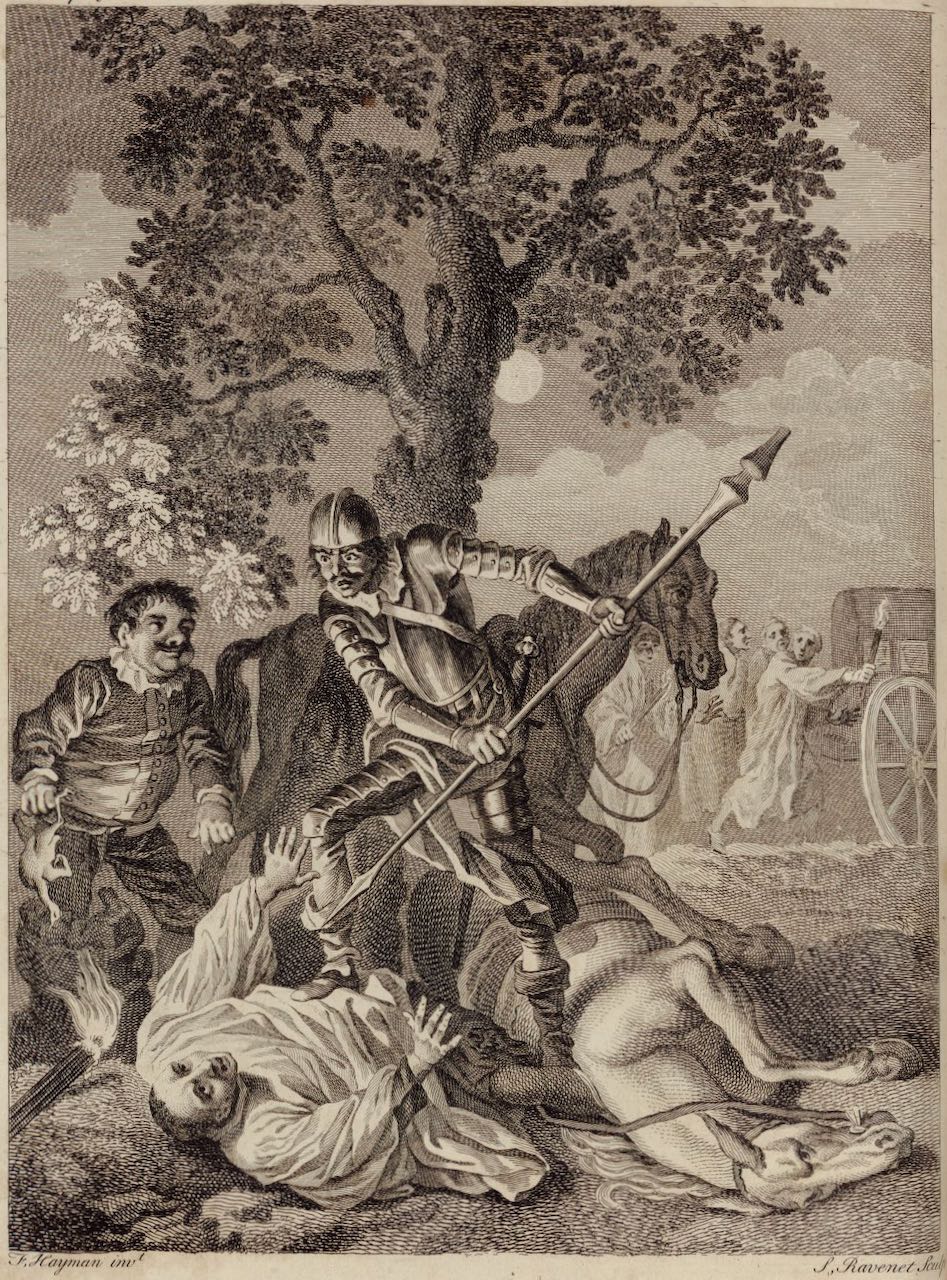 Don Quixote attacks a procession of priests. They are bound for Segovia and are carrying the bones of a gentleman who died and was originally interred in Baeza. After knocking Alonso López and his mule to the ground, Don Quixote holds his lance to his throat and interrogates him. Sancho Panza observes him, holding a chicken he found on a pack mule. The scene is lit by a fallen torch. In the background, the other priests flee into the fields. Signed by F. Hayman (illustrator) and S. F. Ravenet (engraver). Part 1, ch. 19.