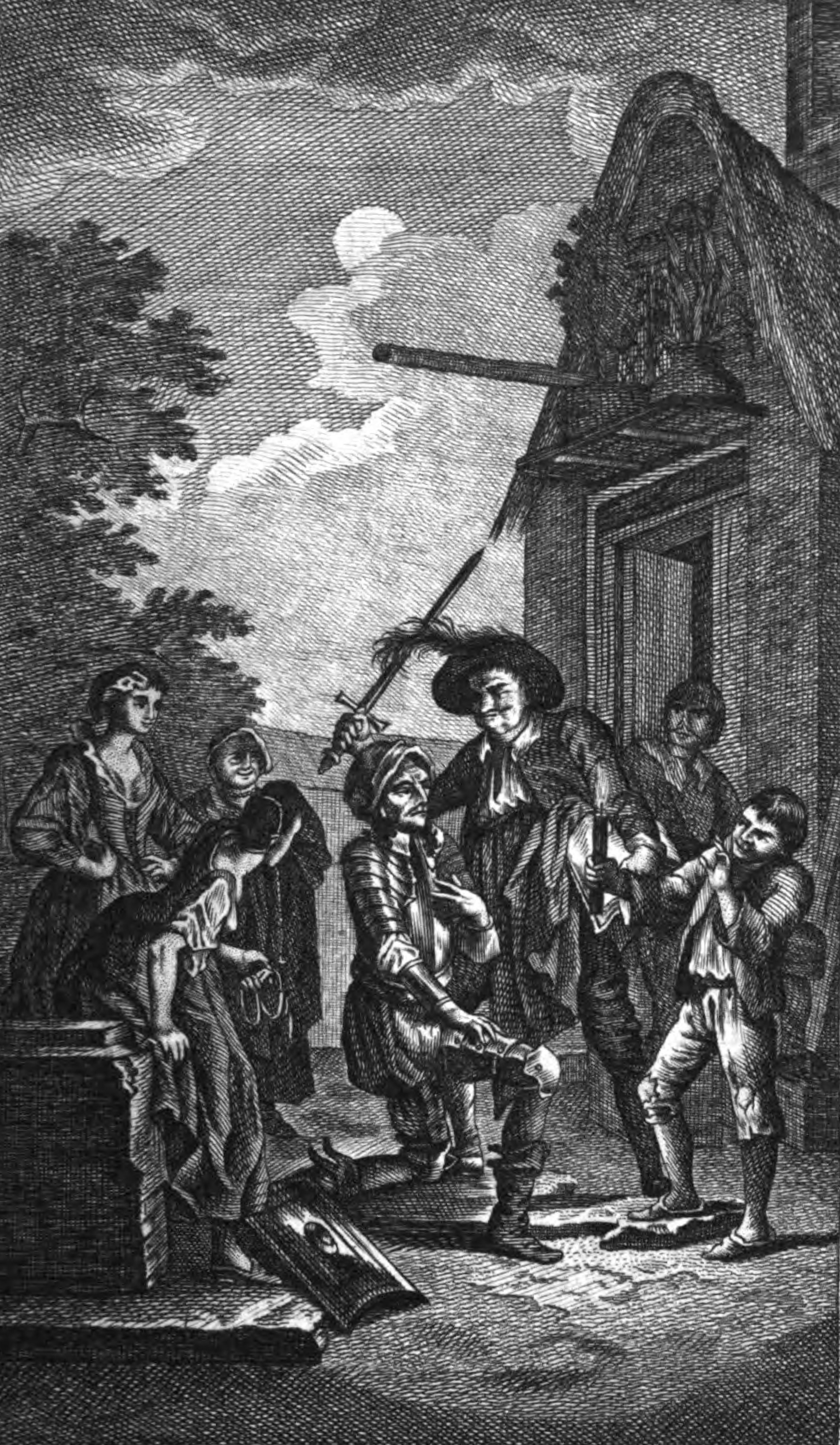 In the backyard of an Inn which Don Quixote has mistaken for a castle, Quixote asks to be knighted by the innkeeper who has has mistaken for a king. The innkeeper agrees to assuage Quixote's madness and also because the other guests of the inn found the whole affair humorous. Before the ceremony he bid one of the ladies to prepare his equipment, and upon her return swore to dignify her name of Tobosa. In a great feathered hat, the innkeeper knighted Quixote with a sword in his right hand and the inn's ledger which he pretended was a holy scripture in his left. Beside the innkeeper, a young boy held aloft a single candle in his right hand. For the entire ceremony Don Quixote recites the knightly prayers he has memorized from reading books of chivalry.