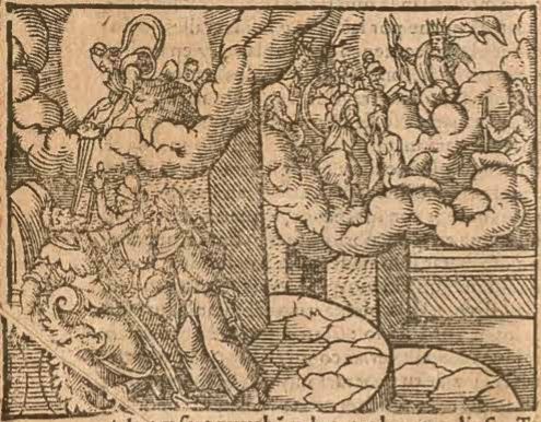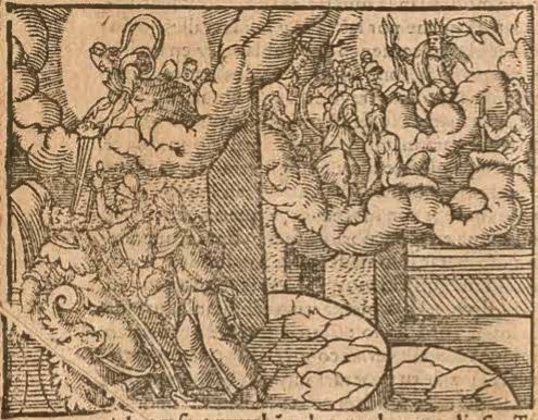 The top right corner of the engraving illustrates many gods sitting on a cloud looking at Jupiter who is wearing a crown and holding thunder bolts. Venus begs Jupiter to stop the assassination of Julius Caesar before it happens. Jupiter, however, explains that there is nothing Venus can do to stop the fates from ending Caesar’s life. The left side of the engraving depicts the assassination of Julius Caesar. Venus is illustrated in a cloud above Caesar with her hands reaching towards him as she transforms him into a star and deifies him once he is dead. Cupid, Venus’ winged son, is depicted directly behind her on the cloud.