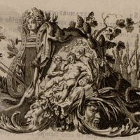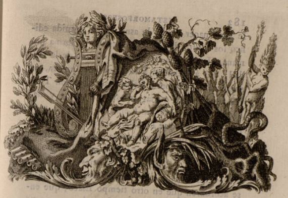 This image appears at the beginning of the eleventh book and contains many elements that appear throughout the book. There is a lyre on the left side of the image which represents Orpheus and his story. There is a reed at the bottom left corner of the image to represents Pan and his musical abilities. The centre of the image depicts Orpheus being attacked by the Maenads. There is a snake in the bottom right corner which is representative of many elements in the book where snakes appear.