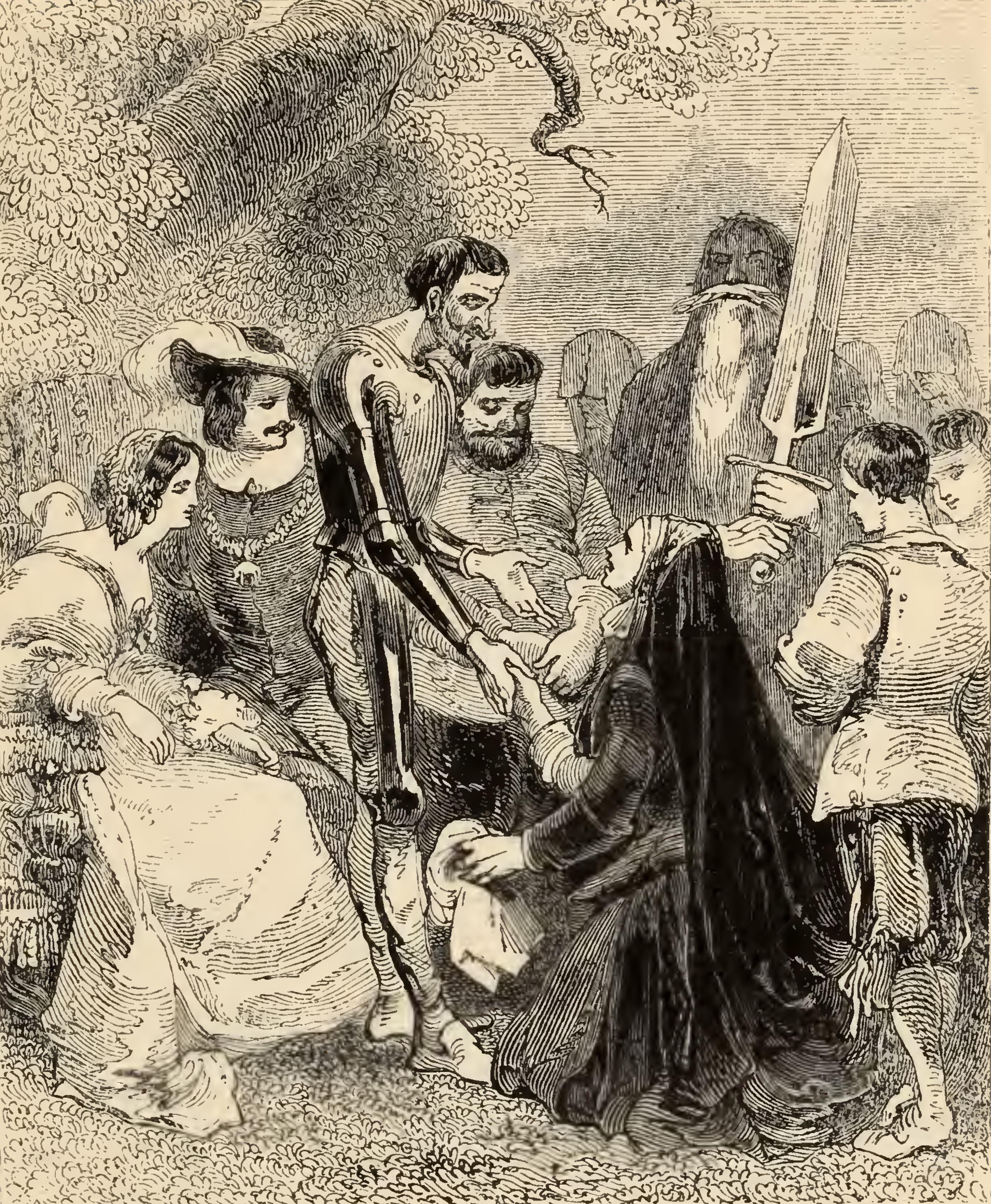 Don Quixote, clad in armor, steps forward to receive the countess Trifaldi, clad in a black robe, she kneels and gives him her right hand while in her left hand she clutches a white cloth. On the left, the duchess and the duke sit and watch this meeting while dressed in courtly attire. Behind Quixote, Sancho Panza holds his hands respectfully and looks towards the ground, while on the right the squire of Trifaldi stands in black robes with a great long white beard and a tall sword grasped in both hands next to two pages dressed in white vests.