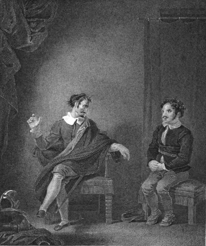 Don Quixote (left) brings Sancho to his chamber to give him advice before he departs to his government which Sancho has been tasked with governing. Sancho sit down by him with his hands grasped and placed daintily on his lap, having laid his hat on the floor to his right. Quixote addresses his squire with much solemnity, crossing his legs, raising his right hand to make a point and leaving his left hand rested on his chair. To the left of Quixote on the floor lies an iron helmet.