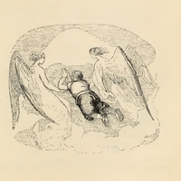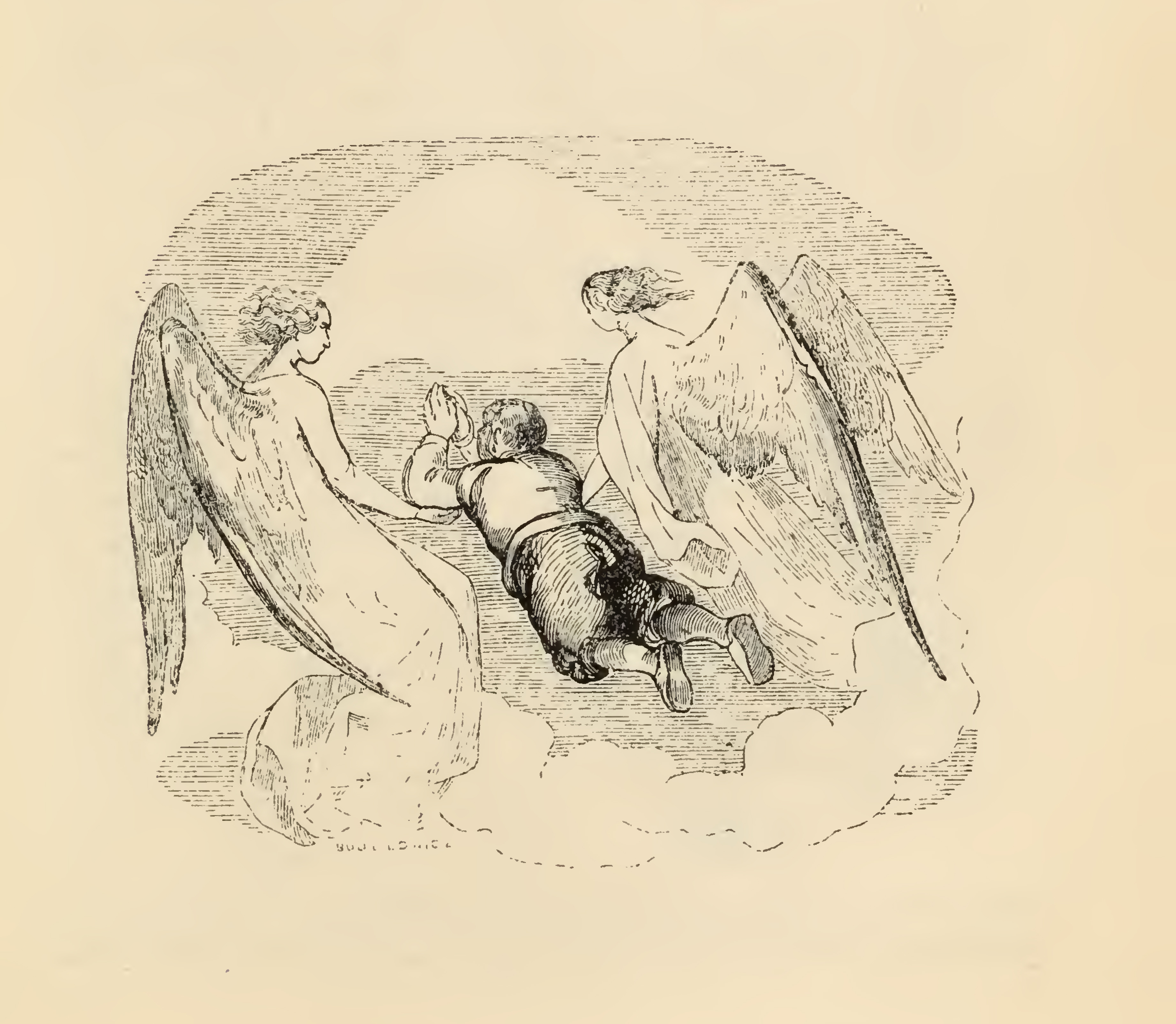 - Sancho Panza (middle) clasps his hands in prayer and ascends above the clouds into the heavens. He is carried by two angels with two large angelic wings.
