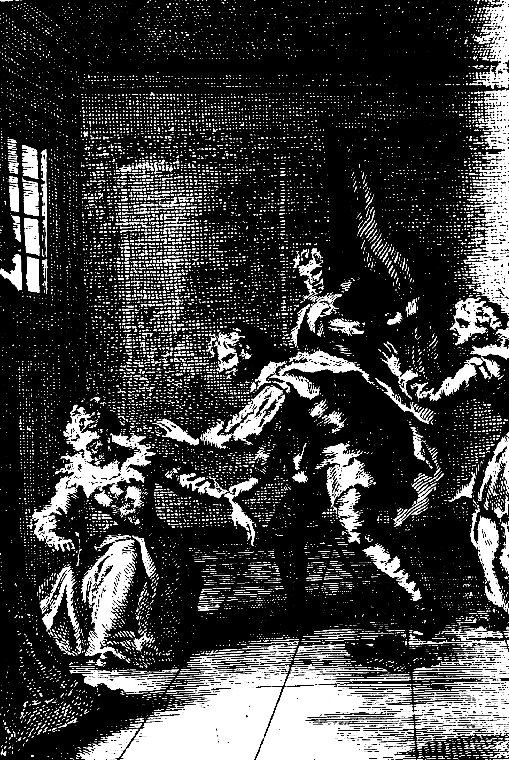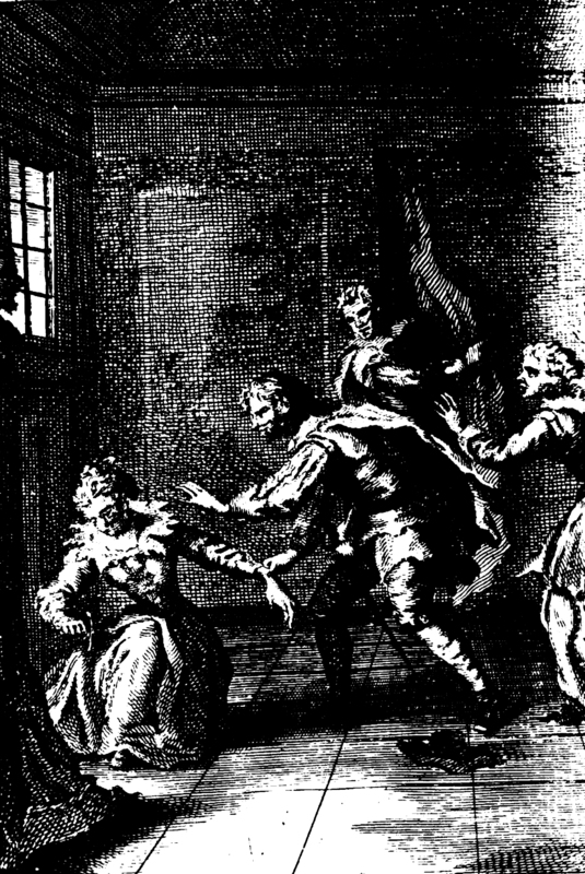 The priest reads aloud a manuscript found in the trunk of an inn. This manuscript relays the story of Anselmo and Lothario, two close friends, and how Lothario has an affair with Anselmo's wife Camilla. The illustration depicts the end of the manuscript wherein Camilla (left) forms a plan to trick Anselmo (foreground rushing towards her) by letting him know that her and Lothario will be meeting in a closet. Camilla meets Lothario (background emerging from closet) in the closet, and knowing that Anselmo is watching pretends to stab both herself and Lothario in order to fool Anselmo into thinking that she wishes to protect her chastity. This way Anselmo will not suspect that Camilla and Lothario will continue their affair.