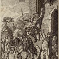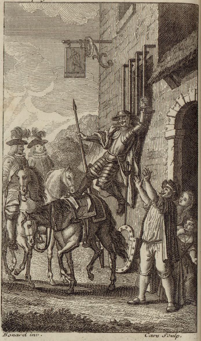 As four travellers (two in the illustration, but four in the text) arrive to the inn, Rocinante moves toward one of the mares, leaving Don Quixote hanging from the window by his hand. The innkeeper, his daughter, and Maritornes appear at the entrance of the inn. Signed by Bonard (illustrator), no given name, and L. Cars (engraver). Part 1, ch. 43.