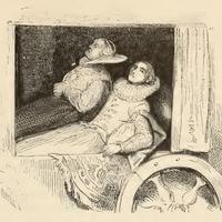 Two women sit in a carriage dressed in courtly apparel, the young women in the foreground looks out of the carriage's window towards the sky, her arm leaning against the sill. In the background, an older woman clasps her hands over her stomach and stares ahead of her. The image is occasioned by Sanchica saying "Would to God it were to-day rather thanto-morrow, though folks that saw me seated in that coach with my lady mother should say: ' Do but see Sanchica the garlic-eater's daughter, how she sits in state, and lolls in her coach like a she-pope! But let them jeer ; let them trudge through the mud while I ride in my coach with my feet above the ground" (Page 537).