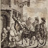 As four travellers (two in the illustration, but four in the text) arrive to the inn, Rocinante moves toward one of the mares, leaving Don Quixote hanging from the window by his hand. The innkeeper, his daughter, and Maritornes appear at the entrance of the inn. Signed by J.-J.-G. Haas (engraver). Part 1, ch. 43.