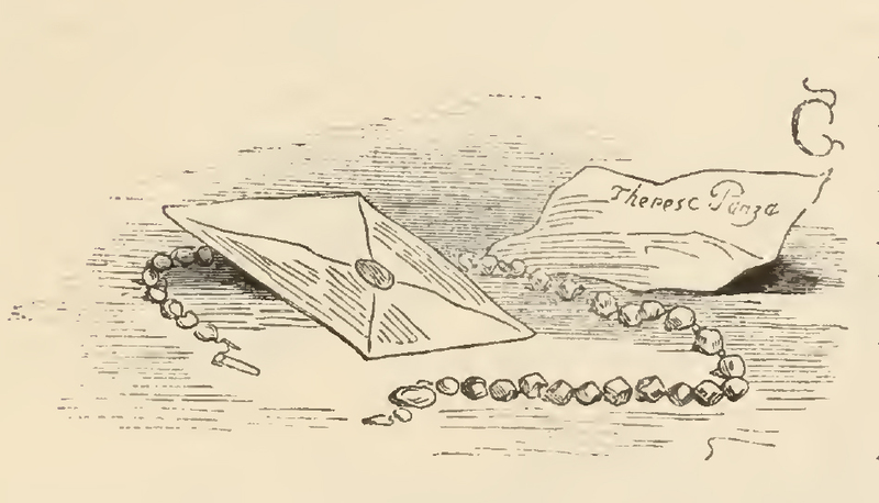 - An envelope lies on the ground in the middle between an opened letter on the right upon which the name "Theresa Panza" is written, whereas on the left lies a large unclasped necklace of rich corals by way of a present from the duchess.