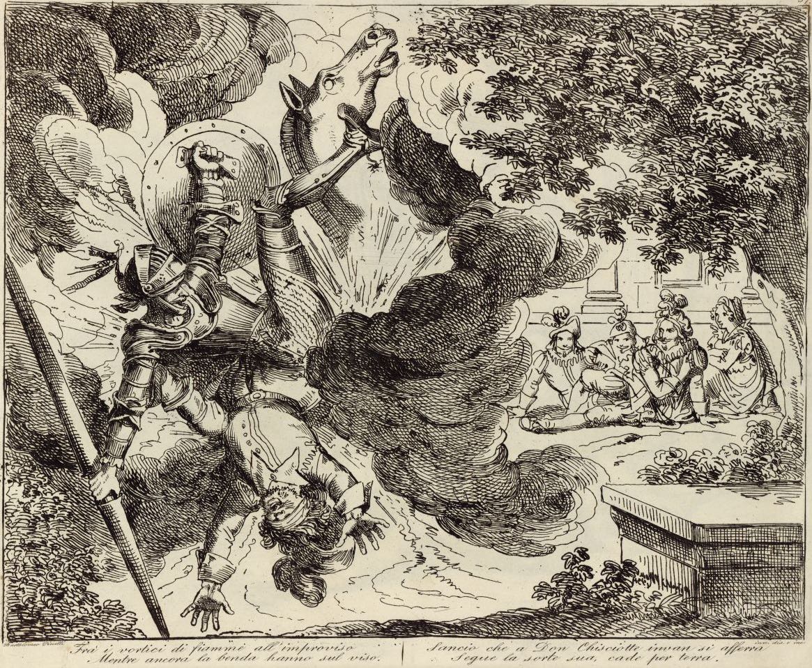 Frà i vortici di fiamme all'improviso / Mentre ancora la benda hanno sul viso. / Sancio cha a Don Chisciotte invan si afferra / Segue la sorte sua, cade per terra.