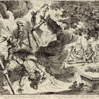 The firecrackers inside Clavileño explode, throwing Don Quixote and Sancho Panza in the air. The duke, the duchess, and their servants (background) observe the scene. Signed by Bartolomeo Pinelli (engraver and illustrator) and dated Rome, 1833. Plate 57. Part 2, ch. 41.