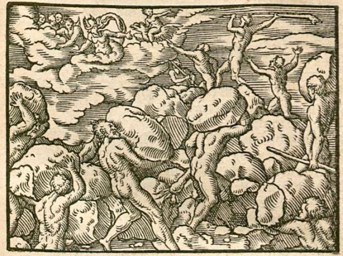 This engraving illustrates giants participating in a war against the god Jupiter, who is depicted in the top left corner of the image surrounded by clouds and other gods on top of Olympus. The giants in the image are carrying rocks and stacking them on top of each other in order to reach Mount Olympus. Mount Olympus proves to be too high to reach, so the giants pile Mount Pelion on top of Mount Ossa in further attempt to reach Jupiter. Before the giants can reach Jupiter, he hurls his thunder bolts on to the mountains that the giants were climbing, eventually knocking them over, which leads to their destruction.
