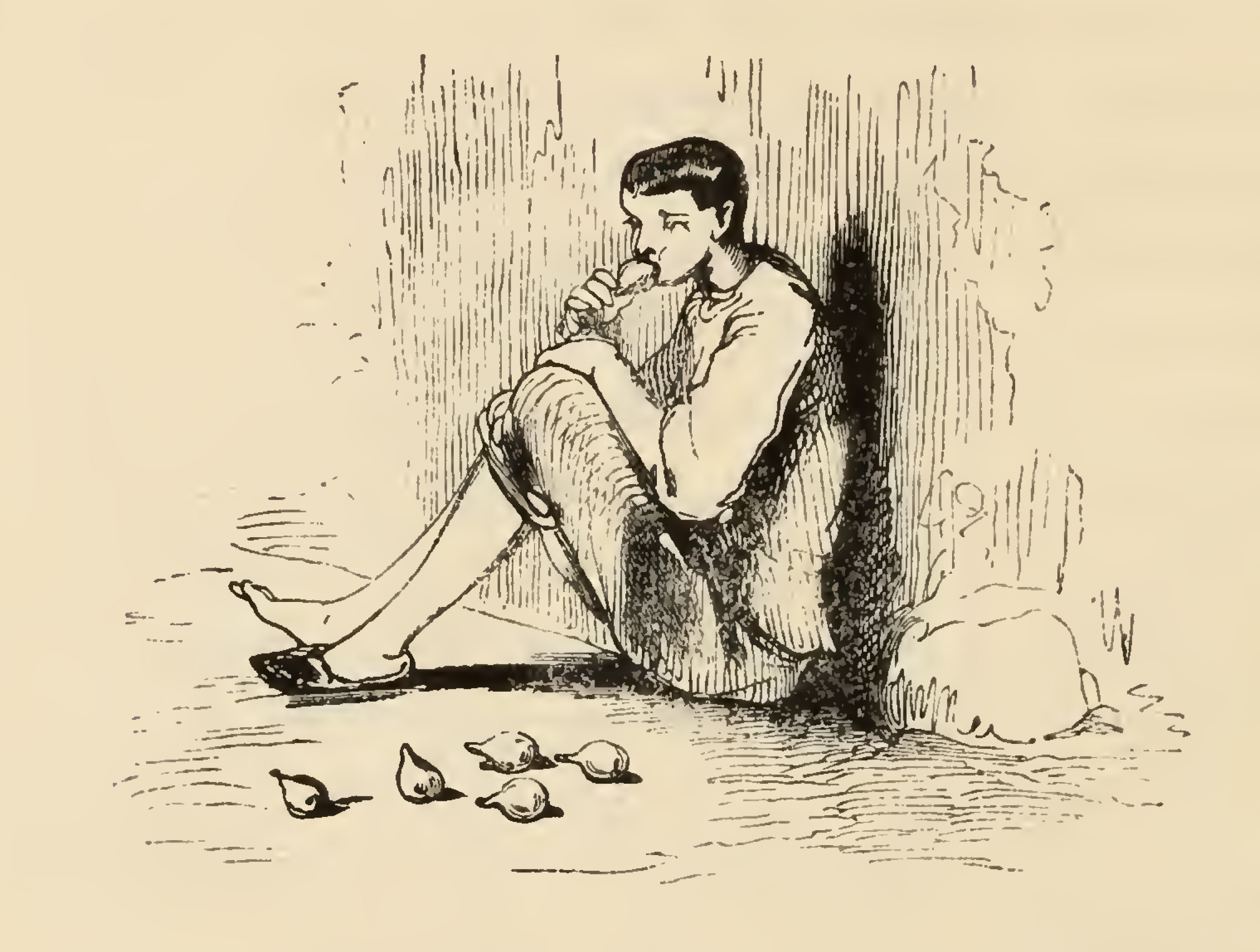A young boy sits against a wall with one shoe on his left foot and eats a pear with his right hand. On the ground by his side lie five more pears. The imae is occasioned by Sancho Panza saying "That is what I renounce, Signor Sampson, my master makes no more of attacking an hundred armed men, than a greedy boy would do half a dozen pears" (Page 48).