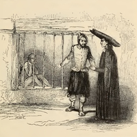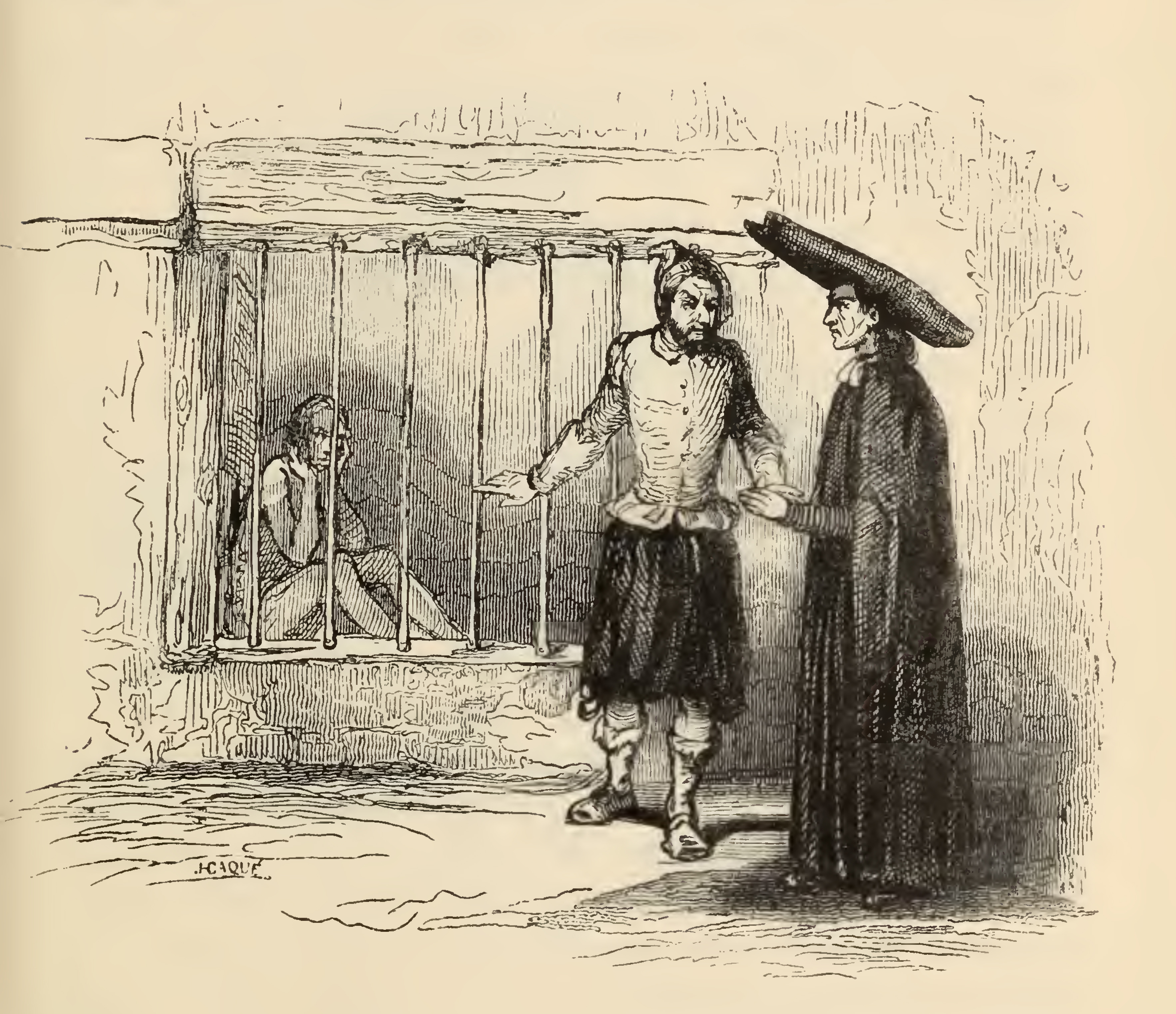 Meeting with Don Quixote to try and persuade him away from knight-errantry, the barber tells a story of what once happened in Seville. In an asylum for the 'insane', a 'madman' (left) sits, his head resting on his hands behind the iron bars of a cell. The licentiate (middle) points towards the madman angrily, having been told that he is not so sane as he says and that he may well not leave at all to save himself the trouble of returning. The chaplain (right) dressed in black robes and a long hat listens to the licentiate rebuke the madman.