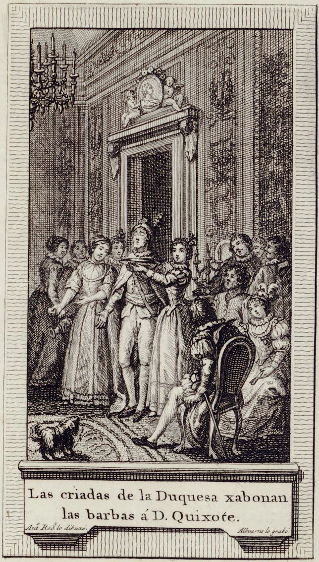 As the table is being cleared after the meal, four of the duchess’ maidens enter the room. The first bears a silver basin, the second a silver pitcher, the third two thick white towels, and the fourth a round cake of Neopolitan soap. They place the basin before Don Quixote, leading him to conclude that it must be the custom in this land to wash one’s beard rather than one’s hands. After the beard-washing maiden has covered his beard with lather, she pretends that there is no water left asks the one with the pitcher to fetch more, leaving Don Quixote waiting. The duke, the duchess, Sancho Panza, and the maidens hide their laughter at the strange and funny sight. Signed by A. Rodríguez (illustrator) and M. Albuerne (engraver). Part 2, ch. 32.
