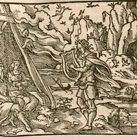 Pained by the death of his new bride, Orpheus was determined to get her back. With his lyre in hand, he travels to the Underworld to convince the lord of the Underworld and his wife, Proserpina, to let Eurydice finish living her life. Orpheus is illustrated in the center of the engraving, singing and playing his lyre to the lord and lady of the Underworld, who are sitting directly in front of him. Charon, the ferryman who carries the dead across the River Styx is illustrated in the background of the engraving in the water. Pluto and his wife were impressed with Orpheus and his lyre playing and singing abilities, and allows him to bring Eurydice back with him, so long as he does not look back to her while they travel out of the Underworld.
