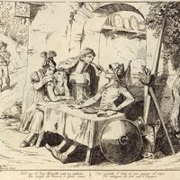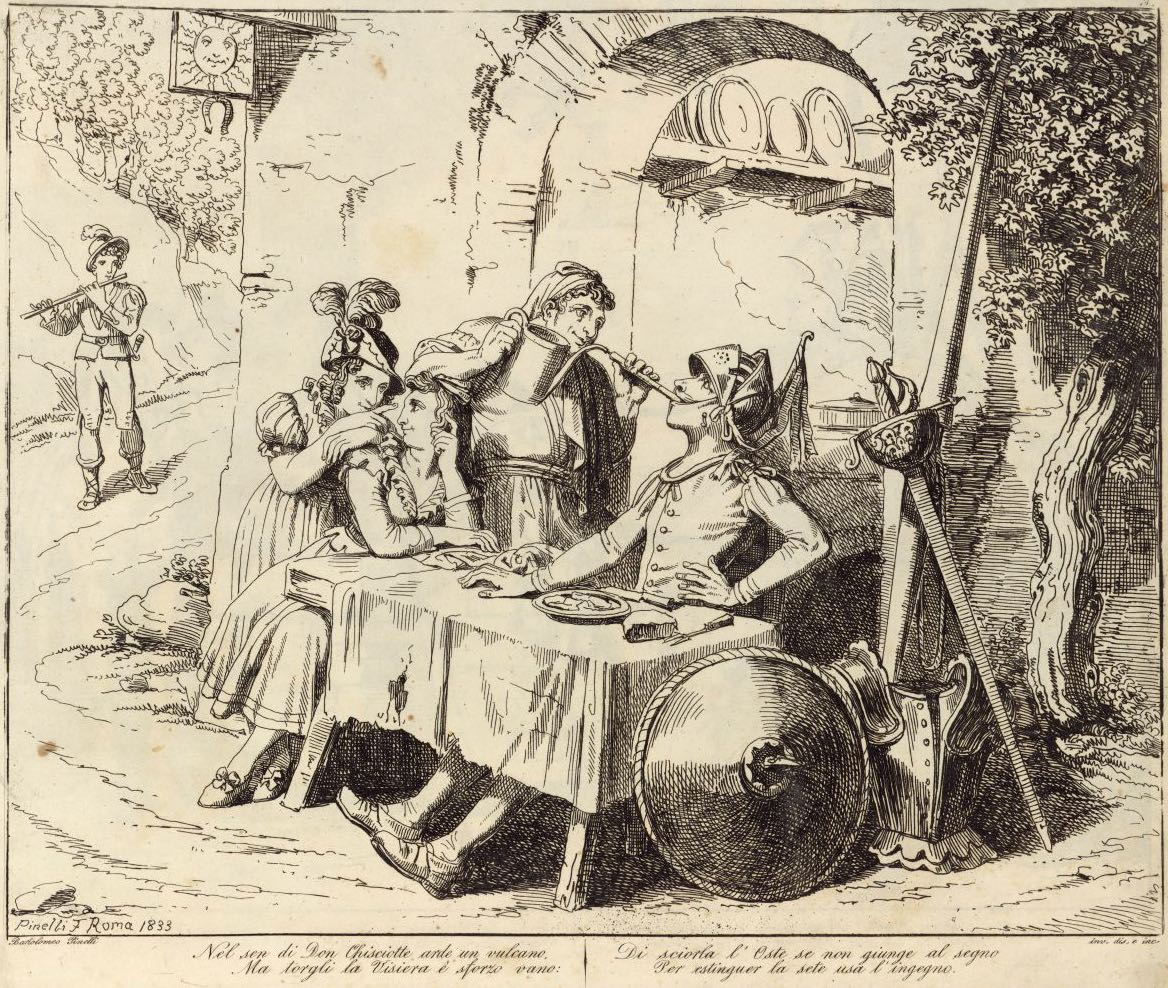 Don Quixote dines at the inn with the innkeeper, Doña Molinera, and Doña Tolosa. They are seated at a table at the door of the inn to take advantage of the cooler air. The innkeeper helps Don Quixote drink wine with a hollow reed through his helmet. In the background, a gelder of hogs arrives at the inn and plays his reed pipe (pictured in the illustration as a flute). Don Quixote mistakes this sound for music played for his entertainment. Signed by Bartolomeo Pinelli (engraver and illustrator) and dated Rome, 1833. Plate 3. Part 1, ch. 2.