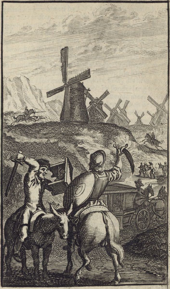 [Don Quixote fights the Basque; the Benedictine friars' servants beat Sancho Panza; Don Quixote charges the windmills]