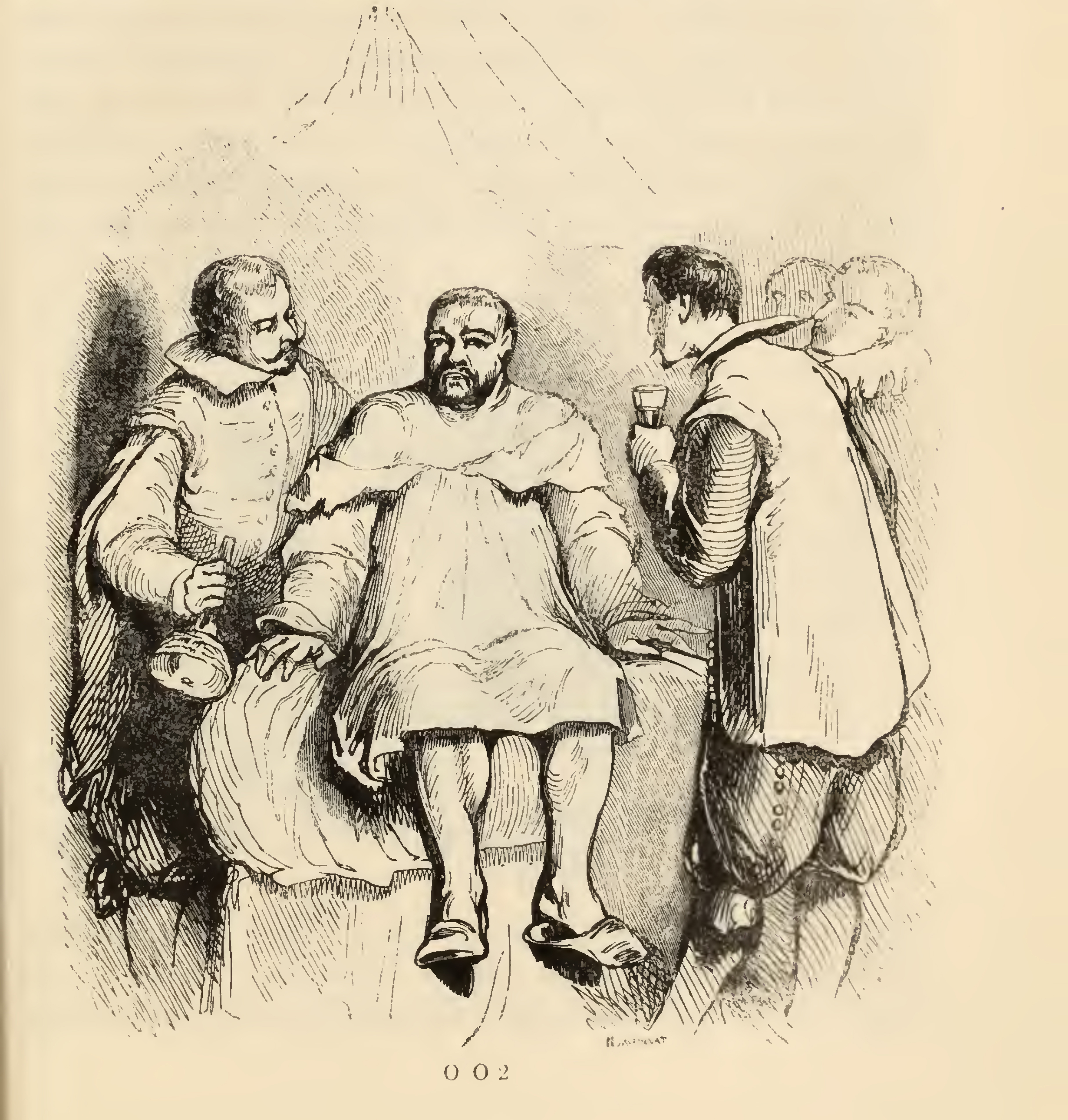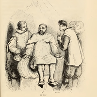 Having been rubbed down with ointment and untied of his shields, Sancho Panza sits upon his bed, dressed in an oversized white shirt and slippers. His face is that of fright, surprise, and fatigue as he holds the bed with his hands. On the left, one of the men who tricked him, looks at Sancho with a face of concern, a bottle of wine in his right hand. On the right, another moustached man looks at Sancho with similar concern, a glass of wine in his left hand. Two other men can be seen on the far right similar to the rest.
