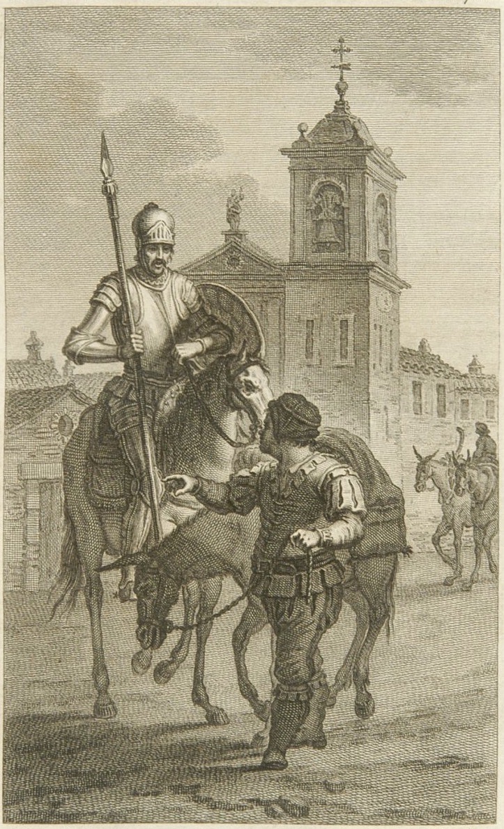 Just after midnight, Don Quixote asks Sancho Panza to lead him to Dulcinea’s palace in El Toboso. They make their way to the church, mistaking its tower for that of a castle. A man (background) with two mules and a plow comes toward them, singing a ballad of Roncesvalles. The illustration is not accurate to Cervantes’ text: the scene is not depicted at night. Signed by J. Rivelles (illustrator) and A. Blanco y Asensio (engraver). Part 2, ch. 9.
