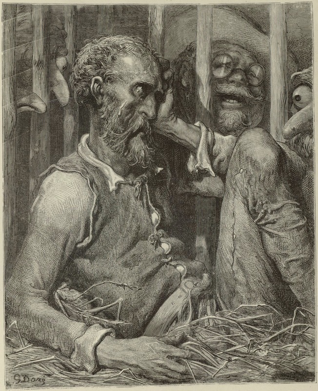 Don Quixote ‘enchanted’ into a cage and surrounded by ‘phantoms,’ in reality Don Fernando, his companions, Don Luis’ servants, the officers of the Brotherhood, the innkeeper, and the priest. He tells Sancho Panza that in all the histories of knights errant he has read, he has never heard of knights being carried on an oxcart. Signed by G. Doré (illustrator) and H.-J. Pisan (engraver). Part 1, ch. 47.