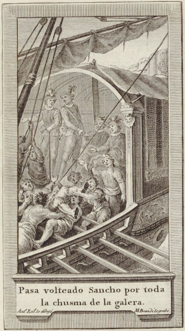 Don Antonio Moreno, Don Quixote, and Sancho Panza visit the galleys at Barcelona’s port. When they reach the harbor, the galleys take down their canopies, flageolets sound, and cannons are fired. The galley slaves hoist Sancho up and toss him from bench to bench, not stopping until they had returned him along the port side back to the stern. Signed by A. Rodríguez (illustrator) and M. Brandi (engraver). Part 2, ch. 63.