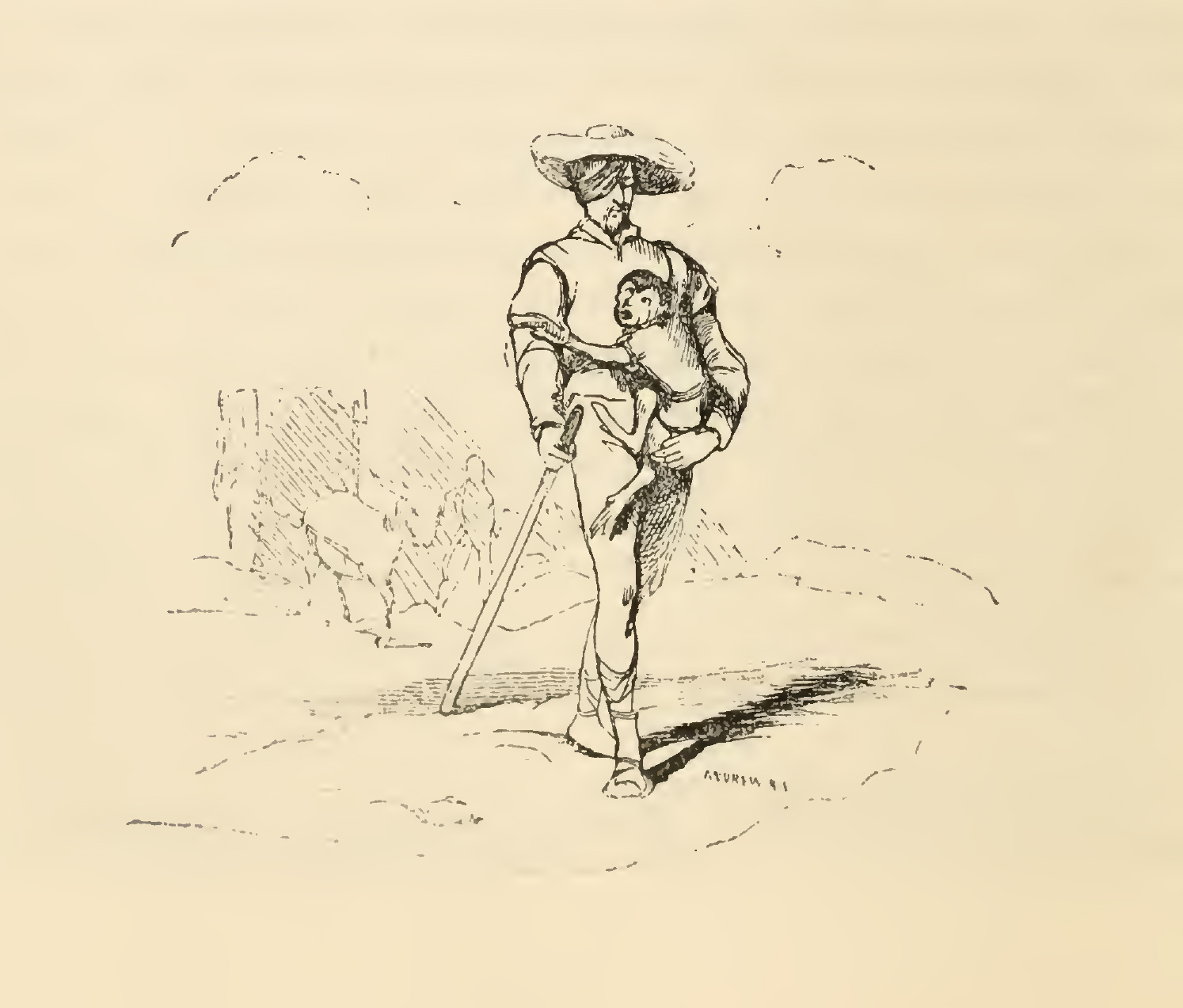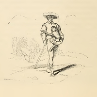 Master Peter, the puppet master with a patch covering his right eye departs from the inn with walking stick in his right hand. An ape is cradled in his left hand that wears a shirt and grasps tightly to Peter's chest. In the background on the left is a cart that carries fragments of his castelet having been destroyed by Quixote, and taking his ape, master Peter, who is Gines de Pasamonte in disguise, walks in quest of farther adventures.