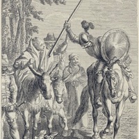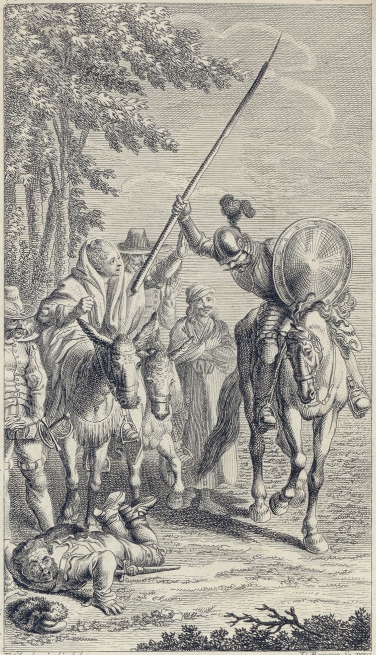 Sancho Panza suggests that Mimicona (Dorotea) is not a genuine princess, provoking Don Quixote. The knight is infuriated and tries to punish him. Dorotea, who understands Don Quixote’s madness, tries to pacify him by claiming that Sancho Panza saw illusions that offended her good name. Signed by D.-N. Chodowiecki (illustrator) and D. Berger (engraver), dated 1779. Plate 6. Part 1, ch. 30.