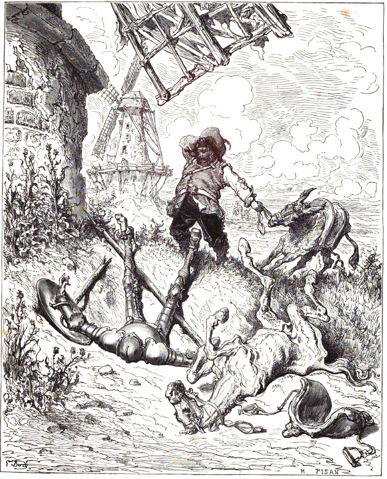 After Don Quixote’s disastrous attack on the windmills he believed were giants, Sancho runs to rescue his master. Don Quixote and Rocinante lie on their backs. Rocinante’s saddle has fallen off and is beside him on the ground. Sancho and his donkey look on in horror. This scene can be found in Part I, Book 1, Chapter 8
