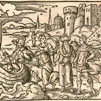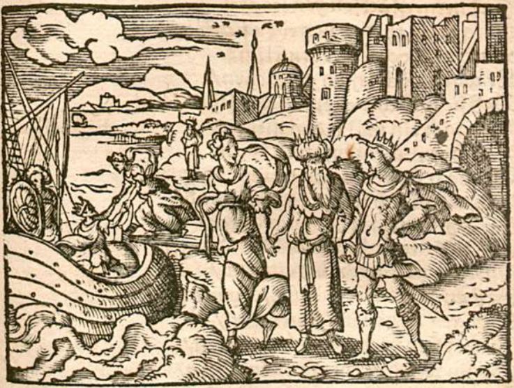 This engraving illustrates King Pandion of Athens with Prince Tereus on his left, and his daughter Philomela to his right. Pandion is wearing a large crown to differentiate himself from the others as king. Tereus was sent to Athens by his wife Procne to fetch her sister, Philomela, in order to reunite with her for a short visit. The ship in the image is to illustrate the method in which Tereus will be escorting Philomela to Thebes. This arrangement, however, ends up being dangerous for Philomela, as Tereus has become irresistibly infatuated with her.