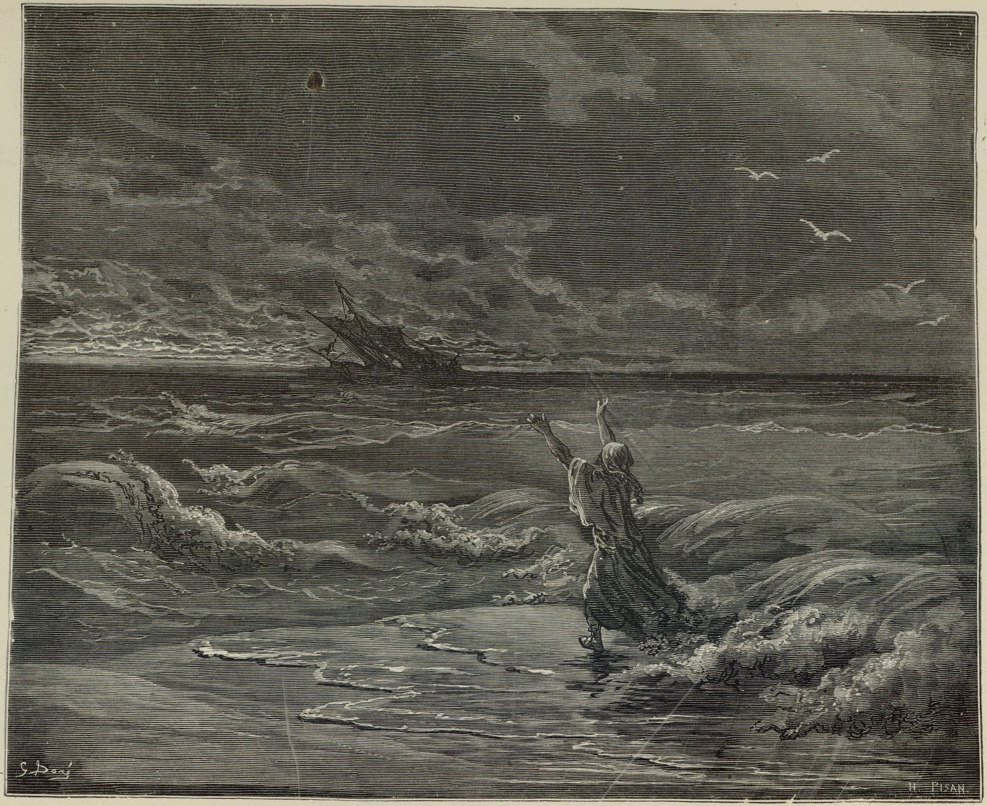 Zoraida’s father, Agi Morato, and the Moor oarsmen are put ashore at Cava Rumía. As the captive and Zoraida leave in the boat, they hear her father cry for his daughter to come back, forgiving her and pleading with her to console her grieving father. Signed by G. Doré (illustrator) and H.-J. Pisan (engraver). Part 1, ch. 41.