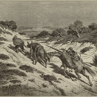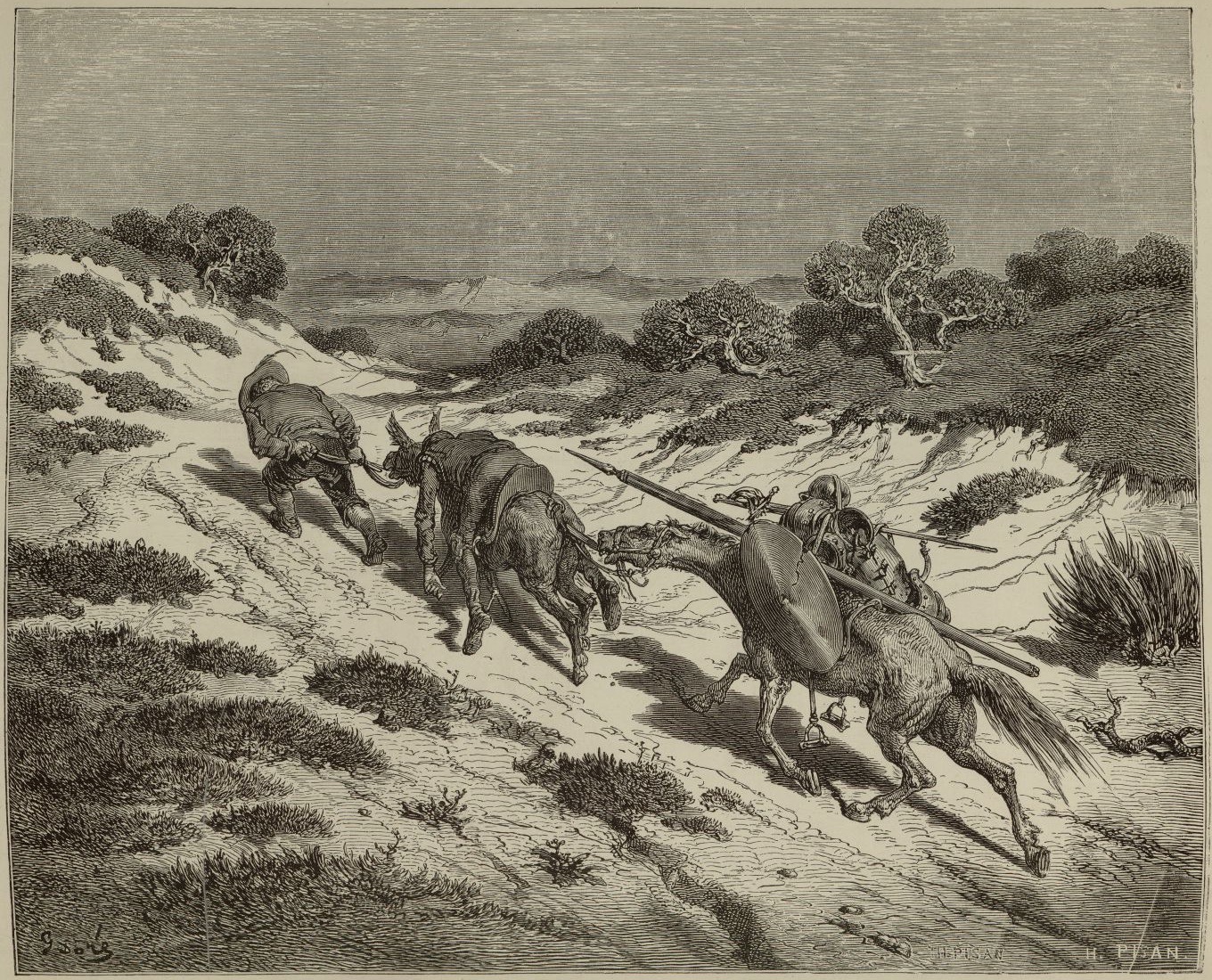 After the fight with the Yanguesans, Sancho Panza struggles to his feet, settles Don Quixote on his donkey’s back, and ties Rocinante behind. Leading his donkey by the halter, he walks in the direction of where he thinks the king’s highway might be. Signed by G. Doré (illustrator) and H.-J. Pisan (engraver). Part 1, ch. 15.