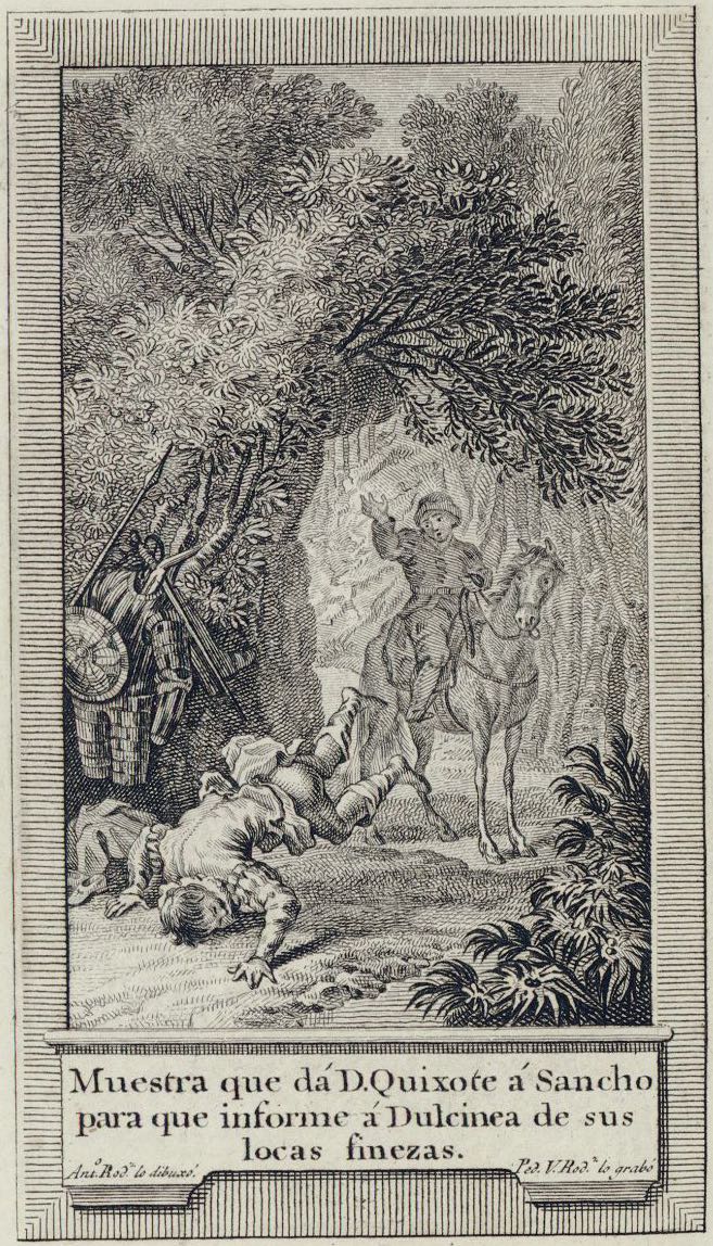 After cutting stalks of broom to serve as markers so he can find his way back, Sancho Panza (background) asks for Don Quixote’s blessing and takes his leave. Mounted on Rocinante, he departs for El Toboso to deliver a letter written by Don Quixote to Dulcinea. Before he leaves, Don Quixote performs cartwheels half-naked as part of his penance. Don Quixote’s armour is pictured hanging from a tree. Signed by A. Rodríguez (illustrator) and P. Rodríguez (engraver). Part 1, ch. 25.