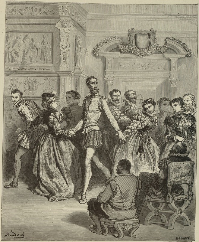 At the soirée, Don Quixote dances with Don Antonio Moreno’s wife and some of her friends. Signed by G. Doré (illustrator) and H.-J. Pisan (engraver). Part 2, ch. 62.
