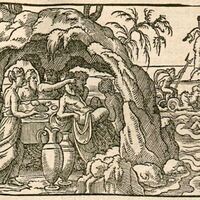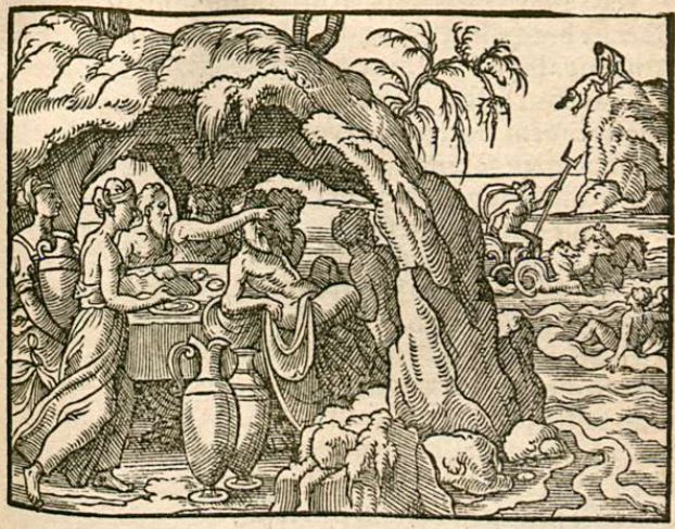 After taking part in the boar hunt in Caledonia, Theseus is being held up at the river Achelous due to its raging currents. The river god, Achelous, urges Theseus to stay with him in the meantime. Achelous is depicted leaning backwards onto a table in the engraving, and Theseus is illustrated with his arm outstretched, pointing to an island in the far distance. Theseus asks about the island and what its story is. Achelous goes on to explain that the island was once a princess named Perimele, and that he had stolen her virginity. When her father found out, he felt dishonored and pushed her off a cliff. This scene is depicted in the background of the engraving. Achelous prayed to Neptune to save her, so he quickly transformed her into the island. Neptune is illustrated emerging from the ocean to signify that he rescues her.
