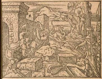 This engraving illustrates the gods Apollo and Neptune in human form on the left-hand side of the engraving with tools in their hands. There are big stones at their feet as they help build the walls of the soon-to-be city, Troy. The trident of Neptune and the lyre of Apollo sit on the stones to indicate that they are in fact gods. There is a man illustrated on the right-hand corner facing the two gods. This is King Laomedon, who had promised Apollo and Neptune a sum of gold in return for their help to build the walls of Troy. King Laomedon, however, does not keep his word and fails to provide the gods with their payment. Upset by this, Neptune causes a great flood which destroys the country’s crops. To further the punishment, Neptune orders that King Laomedon’s daughter, Hesione, will be tied to a rock and fed to a sea-monster. Hesione is illustrated in the background of the engraving, tied to the rock whilst being rescued by Hercules.