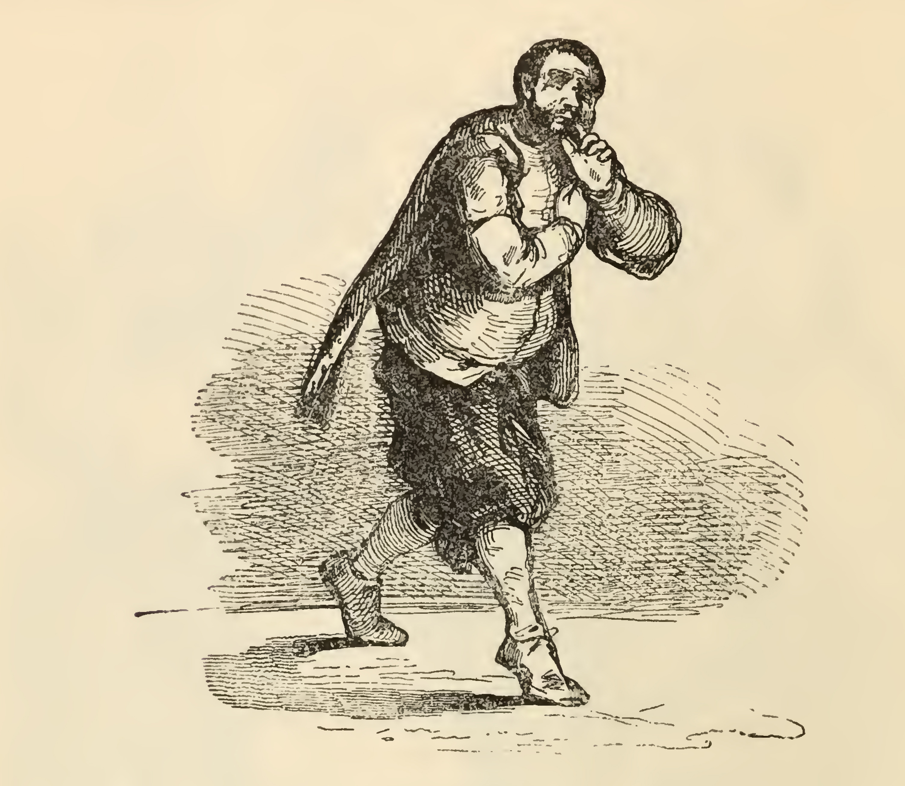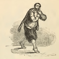 Sancho moves around the room with stealthy steps, allowing only the balls of his feet to touch the ground. His body is bent, and his finger on his lips. The image is occasioned by the duchess asking Sancho to speak freely, and the squire, not wanting to be overheard by his master, looks for any signs of any who would overhear him and bring him trouble.