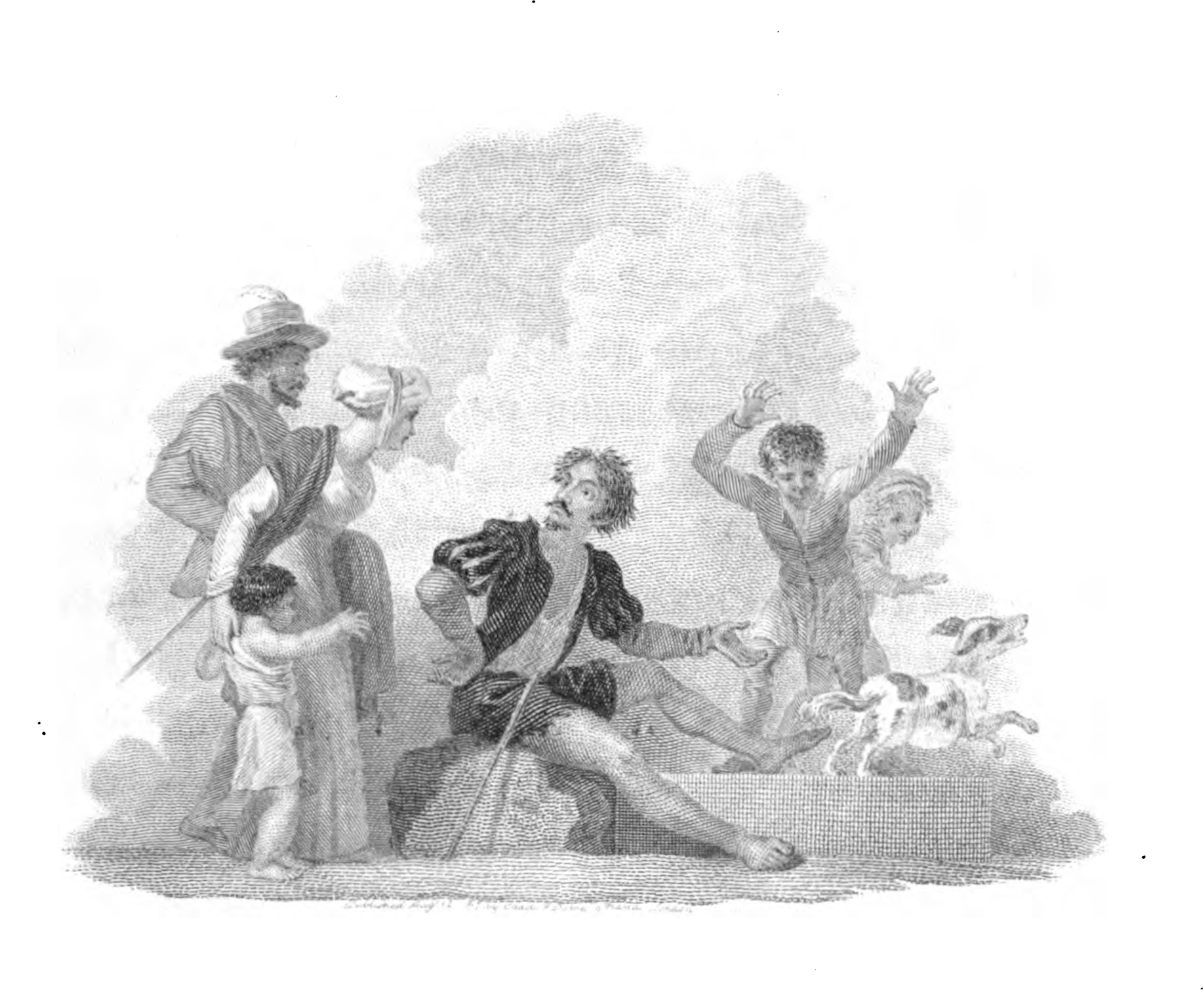 In the city of Seville, a man with a hollow cane, pointed at one end, let's go of a dog, having applied the pointed end of the cane to the dog's posteriors, tried to blow it up as round as a ball. Having slapped the inflated body of the dog, he let him go, saying to the numerous surprised bystanders: “ Well, gentlemen, I suppose you thinkit an easy matter to blow up a dog?” Two children on the right follow the bloated dog, one boy with his hands in the air, and a young girl reaching towards the dog. Meanwhile, the onlookers on the left consist of a bearded man with a feathered cap, a woman asking the man with the hollow cane why he would commit such an act, and a child by her side.