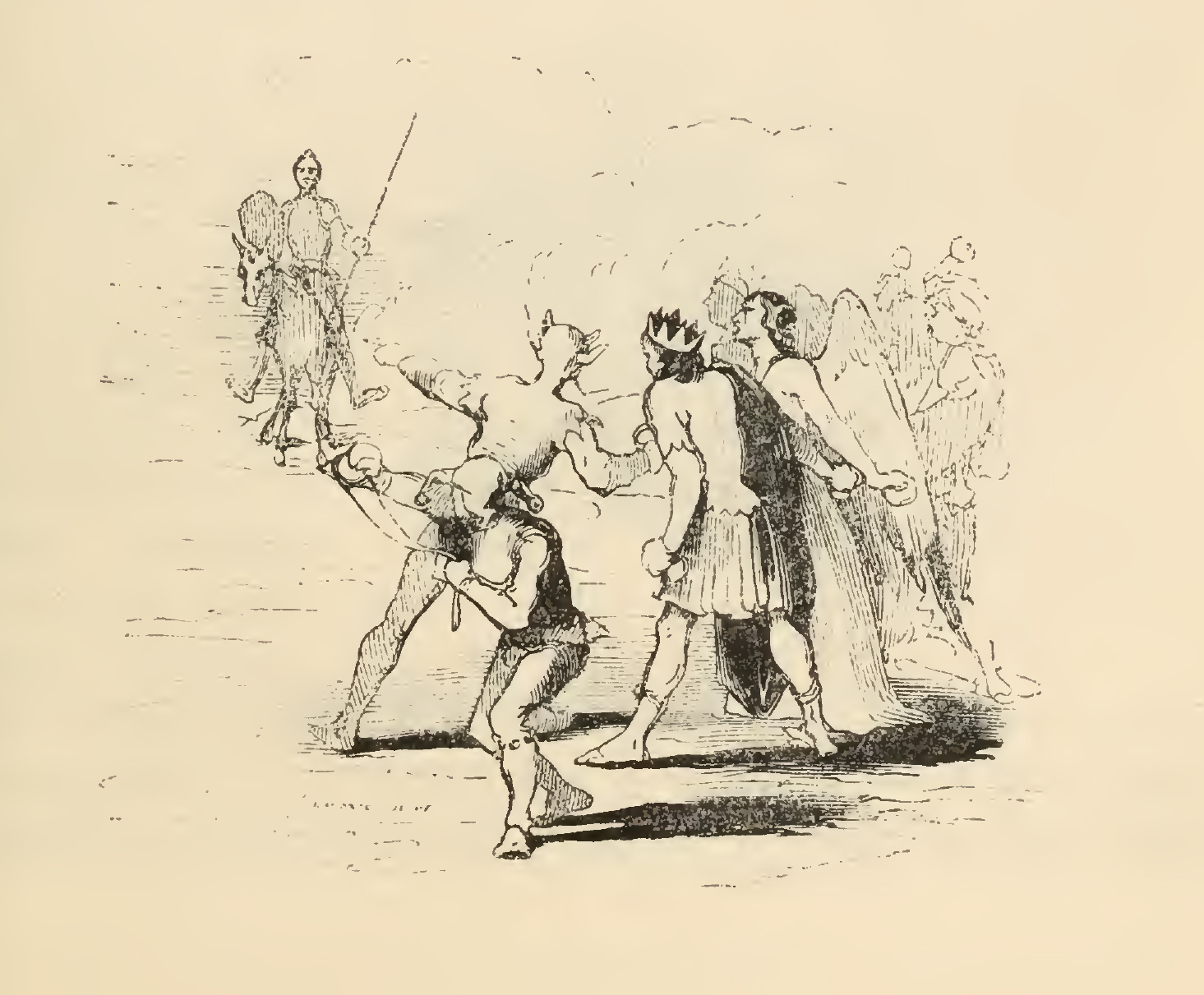Don Quixote (left in the background), clad in armor with a lance and shield by his side, mounted upon Rocinante, chases after the cart of players that have wronged him and his squire, yelling out at them for their treachery. Hearing these cries, the players jump out of their cart, every one from the angel to he who was dressed as death, and cupid, and the devil, all of them taking up stones and preparing themselves for battle, waiting to receive Don Quixote.