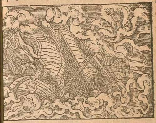 This engraving illustrates a horrible storm that engulfed the ship of Ceyx and his crewmembers. Ceyx, the king of Thessaly, left his native land to seek out the Oracle at Claros. His wife, Alcyone, had begged him not to travel by sea as she knew there were dangers associated with naval travel. He went, despite her warnings, and found himself amidst a terrible storm. King Ceyx can be vaguely seen behind the figurehead at the bow of the ship. King Ceyx continued to call out the name of his wife as the ship was being destroyed. King Ceyx and Alcyone are illustrated at the top-right hand corner of the engraving in clouds in an embrace. Ceyx dies in this shipwreck.