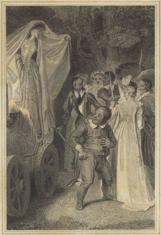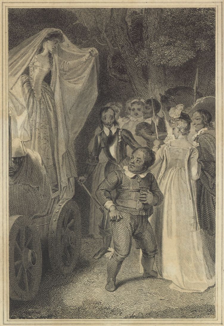The enchanted Dulcinea (a page disguised) removes her veil and reproaches Sancho Panza for not wanting to whip himself to disenchant her. In the background, Don Quixote, the duke, and the duchess are pictured. Signed by T. Stothard (illustrator) and C. Armstrong (engraver). Part 2, ch. 35.