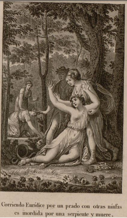 Corriendo Euridice por un prado con otras ninfas es mordida por una serpiente y muere
