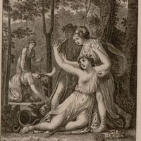 This engraving depicts the new wife of Orpheus, Eurydice, surrounded by naiads. While taking a walk with the naiads one day, Eurydice had stepped on a poisonous snake that had been hiding in the grass. This is depicted in the engraving, with Eurydices’ hands in the air in shock, with her head facing the snake to look at what had bit her. One of the naiads is depicted catching Eurydice as she falls and the other naiads look shocked. The snake bites Eurydice and the venom kills her, which results in her husband, Orpheus, going to the Underworld to try to save her.