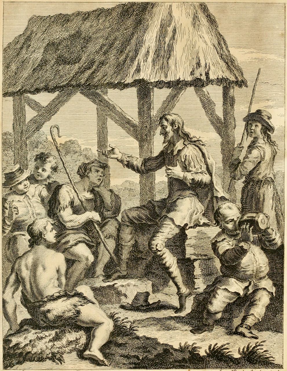 Don Quixote delivers a speech about the golden age to a group of goatherds. The goatherds are gathered around Don Quixote, whose figure is at the centre of the composition. Sancho Panza appears in the right foreground, drinking wine from a cup. The goatherd in the left foreground is drawn with a classical figure. Plate no. 8, signed by J. Vanderbank (illustrator) and G. van der Gucht (engraver). Vol. 1, book 2, ch. 3.