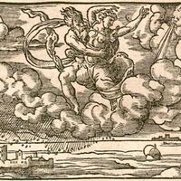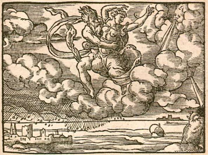 This image depicts the abduction of Orithyia by Borea, the god of wind. There is a face in the top right corner of the image blowing wind to symbolize that he is the god of wind. Borea is depicted at the top of the image floating in the sky as he grabs Orithyia by the waist. Orithyia is depicted trying to get away from Borea as her arms are in the air and she is looking away from him. Borea was taken with Orithyia and her beauty, and when she rejected his charming advances, he became aggressive and abducted her.