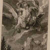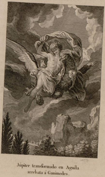 This image depicts Jupiter disguising himself as an eagle to abduct a boy that he was in love with. The engraving illustrates Jupiter in the form of a giant eagle, carrying away the Phrygian boy named Ganymede. Ganymede has his left arm wrapped around the eagle’s neck and the other arm is holding a piece of fabric that is blowing in the wind. Jupiter took him away from Phrygia and brought him up to the heavens to handle his mixing cups.