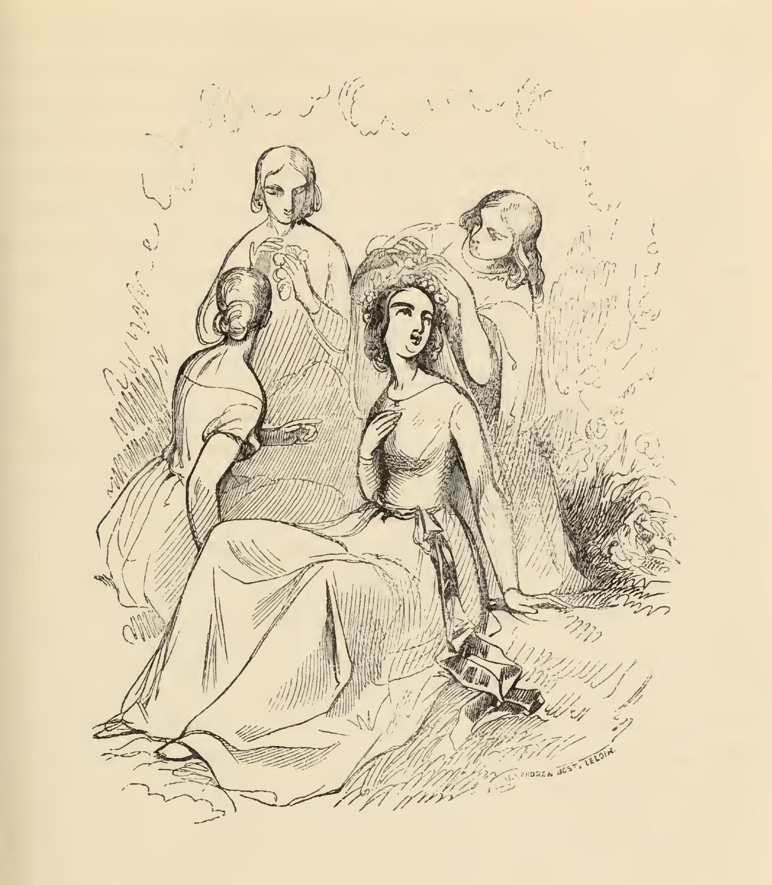 A woman sits on a grassy hill in a white dress and satin belt, with her right hand on her chest and her left leaning against the ground. She looks off into the distance on the right as a woman standing behind her places a garland of flowers on her head. On the left two more women aid the virgin dress lavishly, one wears a bun and points towards the one on the right while the other with shoulder length hair fiddles with a string of acorns. The image is occasioned by Don Quixote saying "Poetry, Signor hidalgo, I take to be like a tender virgin, very young and extremely beautiful, whom divers other virgins, namely, all the other sciences, make it their business to enrich, polish and adorn; and to her it belongs to make use of them all, and on her part to give lustre to them all."