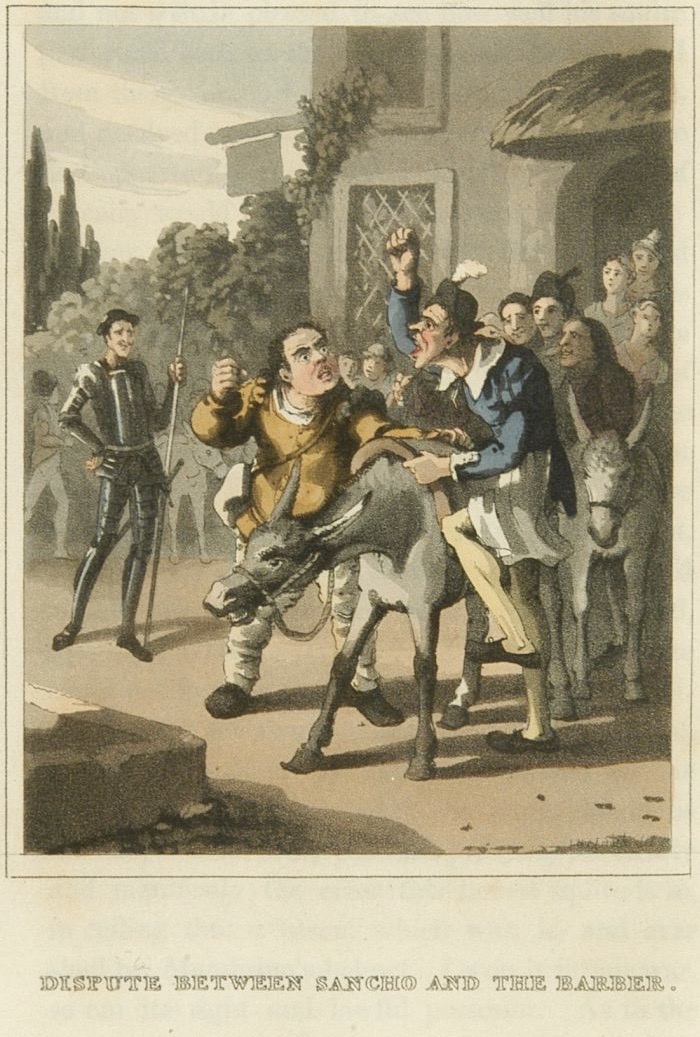 - In the foreground, Sancho Panza and the barber fight over the packsaddle. In the background, Don Quixote looks on. A few of the guests at the inn are also pictured (right). Unsigned. Part 1, ch. 3.