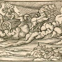 This engraving illustrates Phaethon controlling his father Phoebus’ chariot and four horses: Pyroïs, Eoüs, Aethon, and Phlegon. Phaethon asked his father to control his chariot in order to prove that he is in fact Phoebus’ legitimate son. Phoebus urged Phaethon to choose anything else but the chariot as it is incredibly difficult to control, and it would likely end in peril. Phaethon insisted on driving the chariot and Phoebus could not refuse as he had already given Phaethon his word. Phaethon is depicted flying in the clouds above a city.