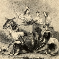 Sancho Panza (left) blocks some country girl's from their path and lays hold of one of them by the halter of their donkey, falling to his knees and introducing himself and his master to the the country girl at the front of the procession. Seeing Sancho act thusly, Don Quixote (right) clad in armor, drops his lance and sword to the ground and places himself on his knees to pray. The two girls in the background speak amongst themselves about the two strange men. The girl in the front who Sancho has called Dulcinea pulls back her hand angrily to whip the two men.